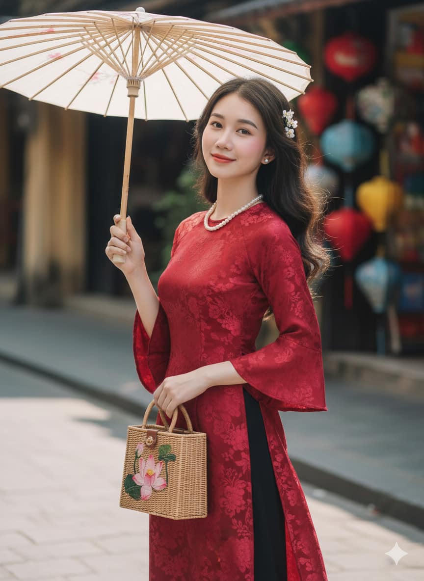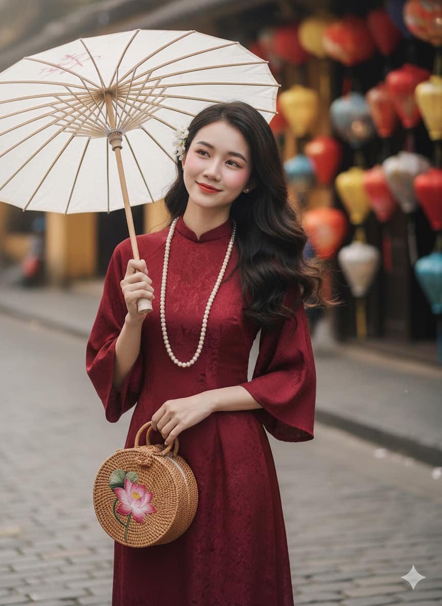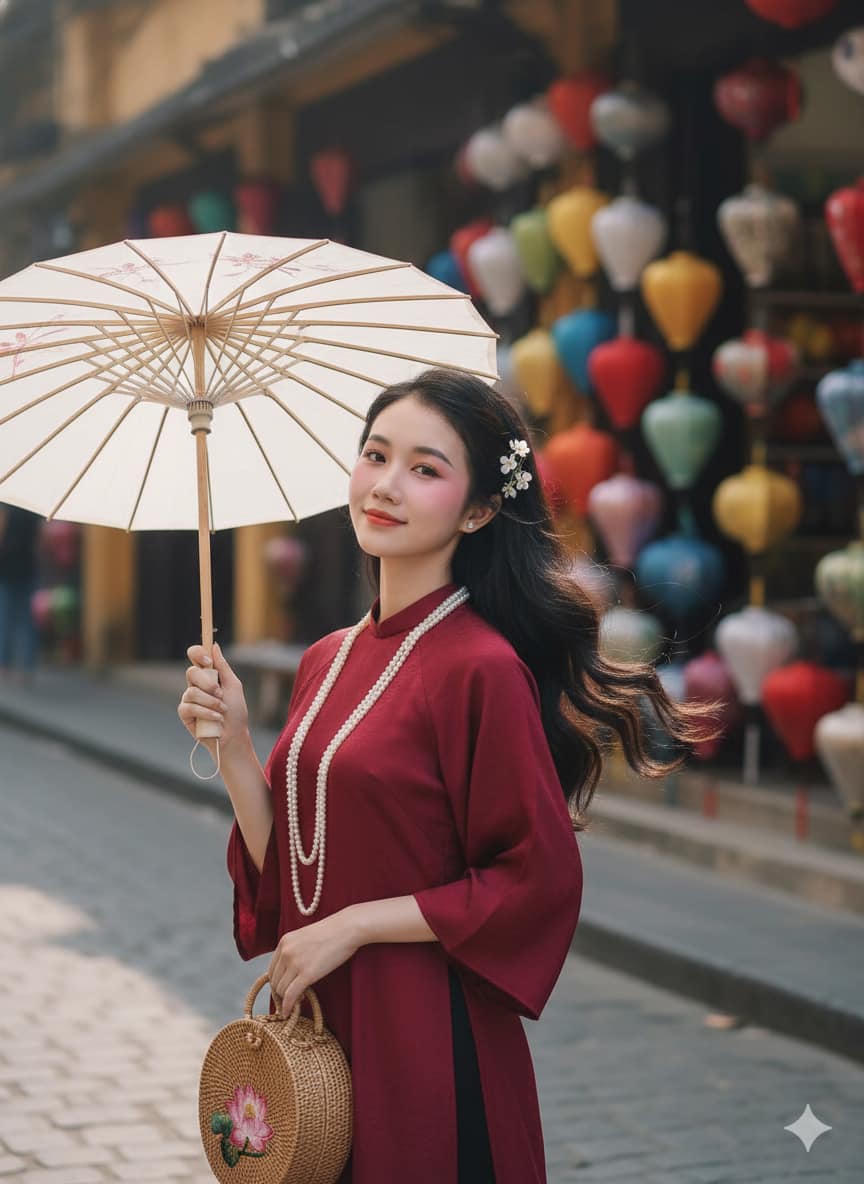 Prompt mẫu 2: "Sử dụng gương mặt tôi đăng tải, giữ nét mặt chuẩn 100%, giúp tôi tạo chân dung cô gái trẻ châu Á đang đứng nghiêng người, ánh mắt nhìn ống kính mơ mộng, miệng cười nhẹ. Cô makeup tone hồng má hồng đậm. Làn da trắng bột. Cô ấy mặc một bộ áo dài truyền thống cách tân màu đỏ đô vải gấm rộng, tay lỡ rộng. Cô đeo một chuỗi vòng cổ ngọc trai màu trắng tinh. Mái tóc cô xõa tự nhiên, uốn nhẹ, bồng bềnh, khẽ rung theo gió , điểm xuyết một vài hoa cài tóc màu trắng. Một tay cô đang cầm chiếc ô giấy màu trắng che đầu, tay còn lại nhẹ nhàng cầm túi cối in hoa sen túi nhỏ mini. Bối cảnh cô gái đứng ngoài lề đường bên phải là gian hàng bán lồng đèn Tết. tạo nên bức ảnh nên thơ, nắng rọi tự nhiên xinh đẹp, chụp chân dung cận cô gái, cảnh vật mờ nhẹ để cô gái sáng trở thành tâm điểm chính.